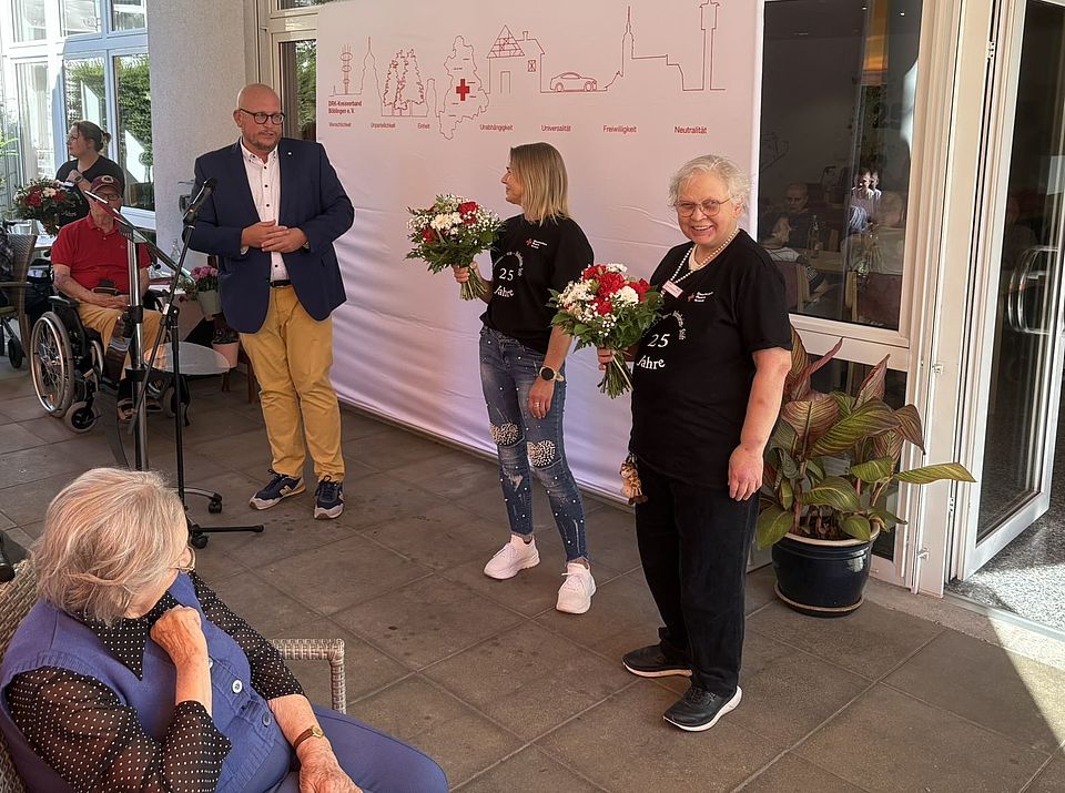 Der Kreisgeschäftsführer ehrte im Anschluss an seine Worte zwei Mitarbeiterinnen, die seit dem ersten Öffnungstag vor 25 Jahren im Franziska-von-Hohenheim-Stift tätig sind.
