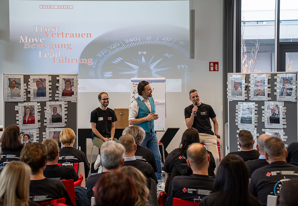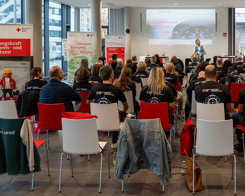 In seiner Begrüßungsrede stellte Kreisgeschäftsführer Wolfgang Hesl erfreut fest: „Dass die Führungskräfte des Kreisverbands und aller vier Tochtergesellschaften alle zusammenkommen, das gab es bisher noch nicht.“ Er lobte die Anwesenden: „Das Rote Kreuz lebt von Ihrer Einsatzbereitschaft. Sie schauen jeden Tag, dass es den Mitarbeitenden gut geht.“ Angelehnt an das Motto „Trust, move and lead“ sagte er: „Ich habe das Vertrauen, dass Sie die maximale Leistung bringen, sich in Bewegung setzen und die Gestaltungsmacht in unserem Verband nutzen.“