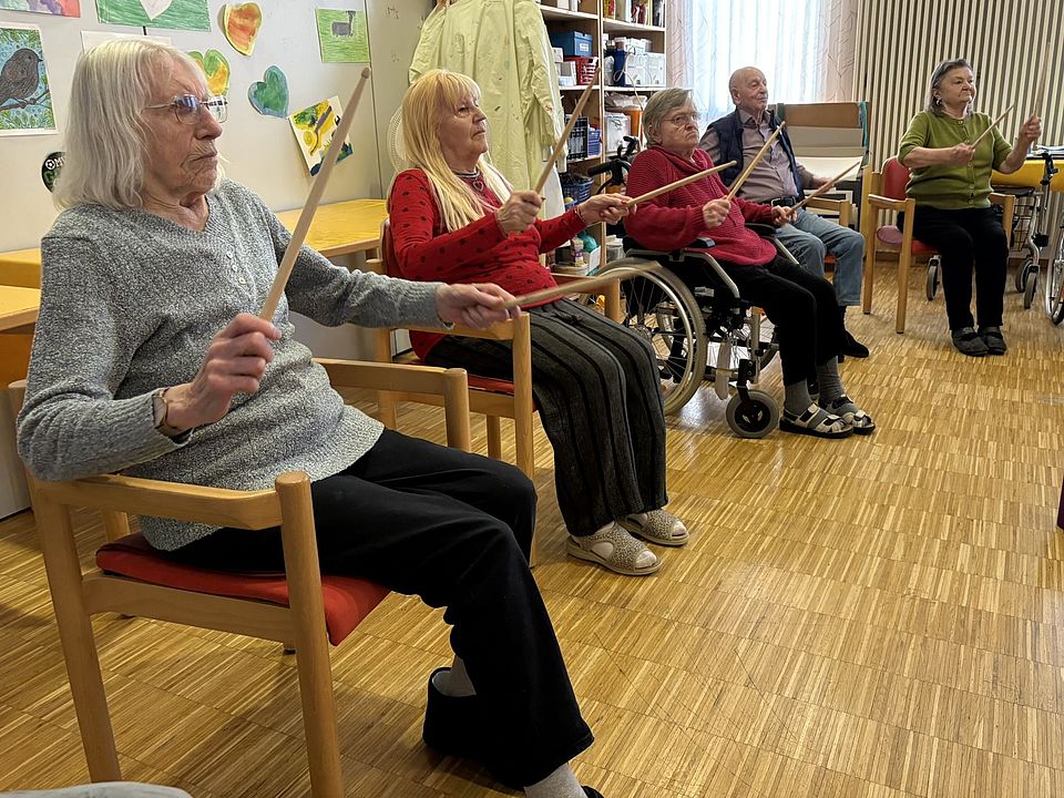 Als Nächstes teilt Carmen Rex Schlagzeugstöcke in der Runde aus. In dem von ihr vorgegebenen Rhythmus klopfen die Tagesgäste mit den Stöcken wechselweise gegen den Stuhl und mit den zwei Stöcken aneinander. In einer zweiten Runde begleiten sie mit den Stöcken ein Musikstück. Eine Frau stellt fest: „Das war anstrengend.“ Die Frage, ob es Spaß gemacht hat, beantworten aber alle mit einem lauten „Ja“.