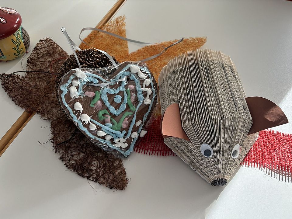 Am Freitagvormittag ist Zeit für die Kreativ-Werkstatt. Dann kommt immer eine Kunsttherapeutin in die Einrichtung und malt oder bastelt mit den Tagesgästen. Dabei ist schon viel Dekoratives entstanden, was den Raum verschönert, zum Beispiel ein aus einem alten Buch gefalteter Igel.