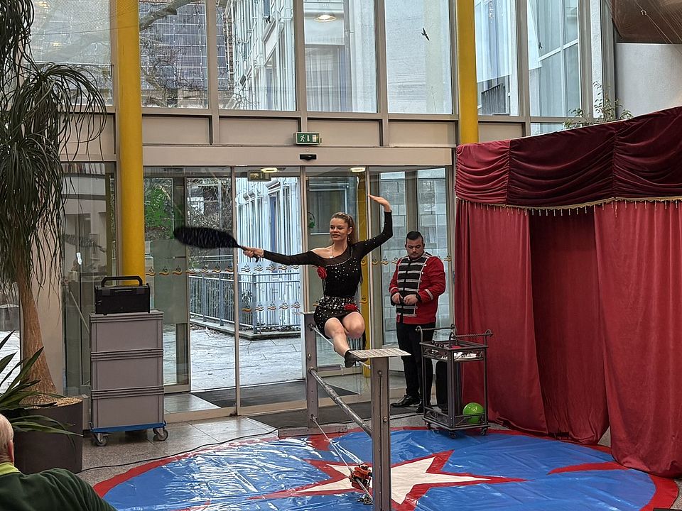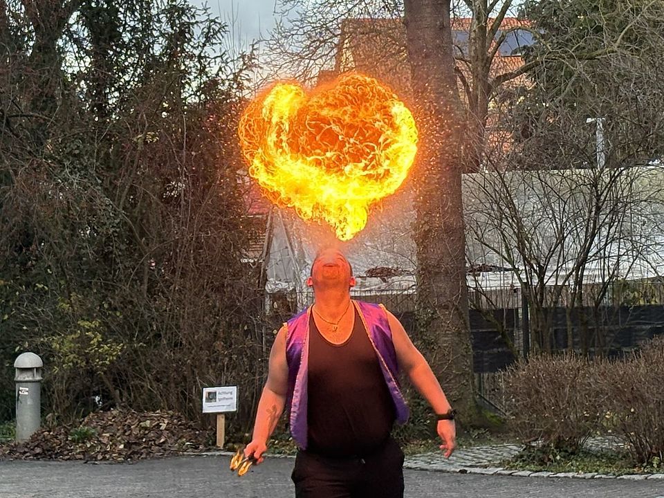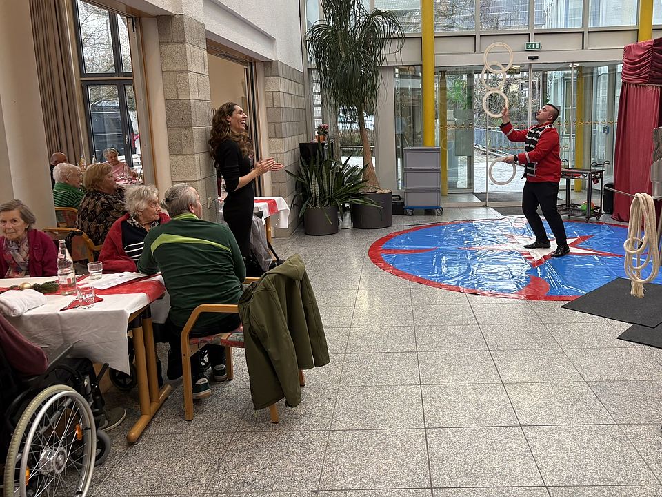 Im Anschluss zog die Vorstellung des Circus Heilig aus Balingen alle in ihren Bann. Das bunte und abwechslungsreiche Programm bot einen Mix aus Artistik, Clownerie und Jonglage. Da kreisten mehrere Hula-Hoop-Reifen gleichzeitig um die Hüften der Artistin, während der Artist geschickt mit Keulen und Ringen jonglierte und sich dann noch vor dem Haus als Feuerspucker präsentierte. Auch ein Balance-Akt auf einem schmalen Stab, das Messer- und Beilwerfen des Artisten knapp neben seine Partnerin und einige Tricks mit einem Seil fanden viel Beifall.