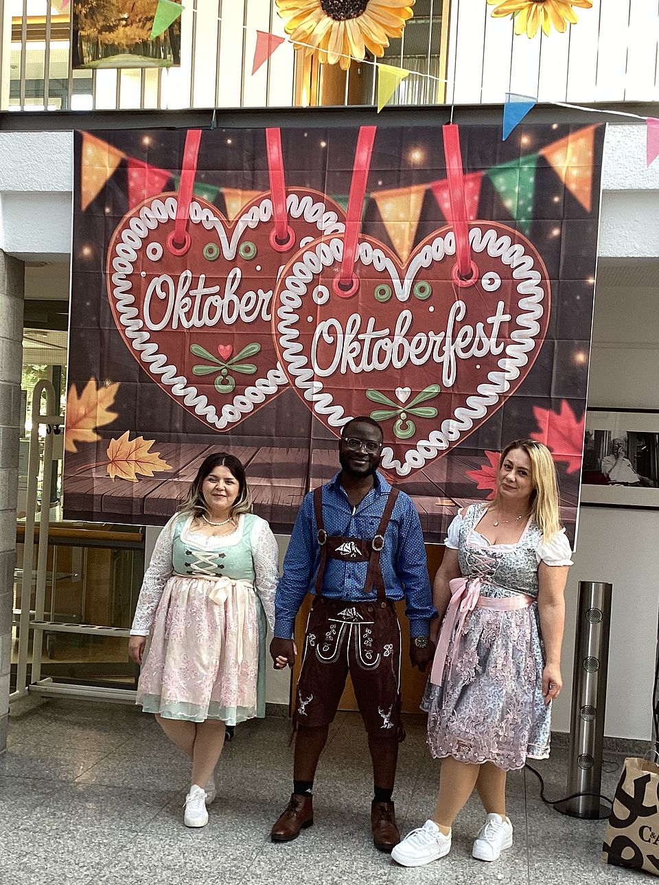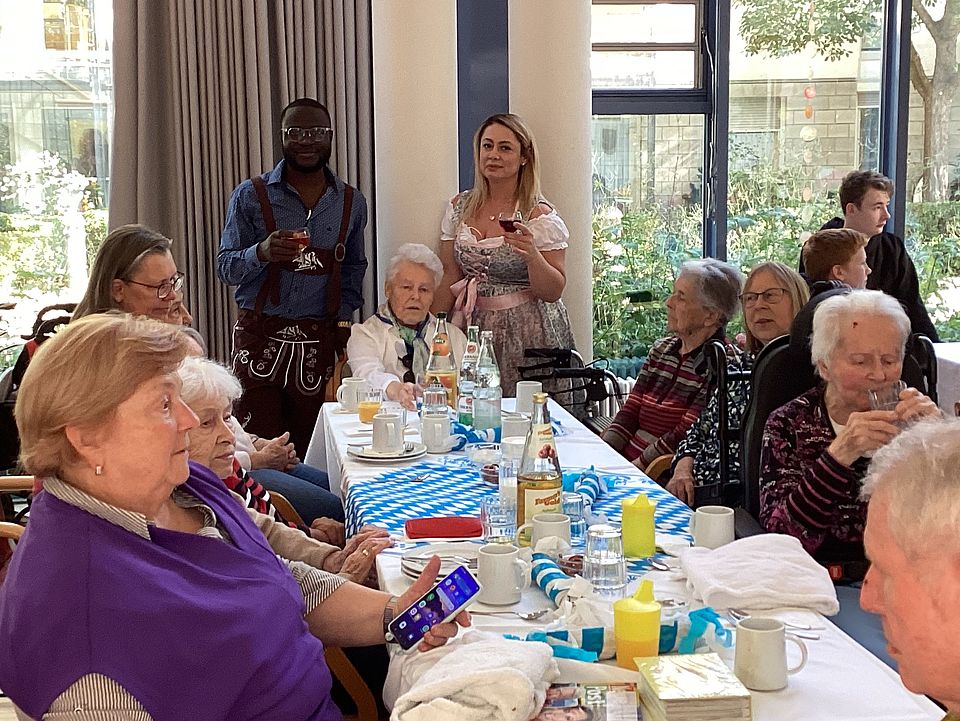 Um das Bild des Oktoberfestes perfekt zu machen, haben sich die DRK-Mitarbeitenden hübsch mit Dirndl oder Lederhosen gekleidet, auch Heimleiter Franky Koungang Likeufack.