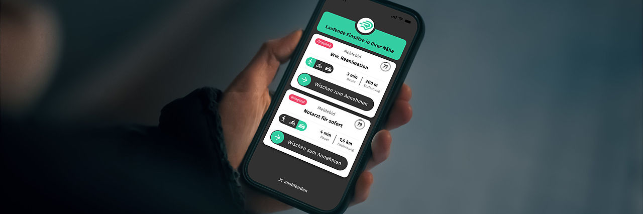 Die Ersthelfer-App gewährleistet im Falle einer zeitkritischen Situation mit Verdacht auf Herz-Kreislauf-Stillstand die Alarmierung von qualifizierten Einsatzkräften für Notfälle, um die Zeit bis zum Eintreffen des Rettungsdienstes zu überbrücken und die Überlebenswahrscheinlichkeit der Patient*innen zu steigern.