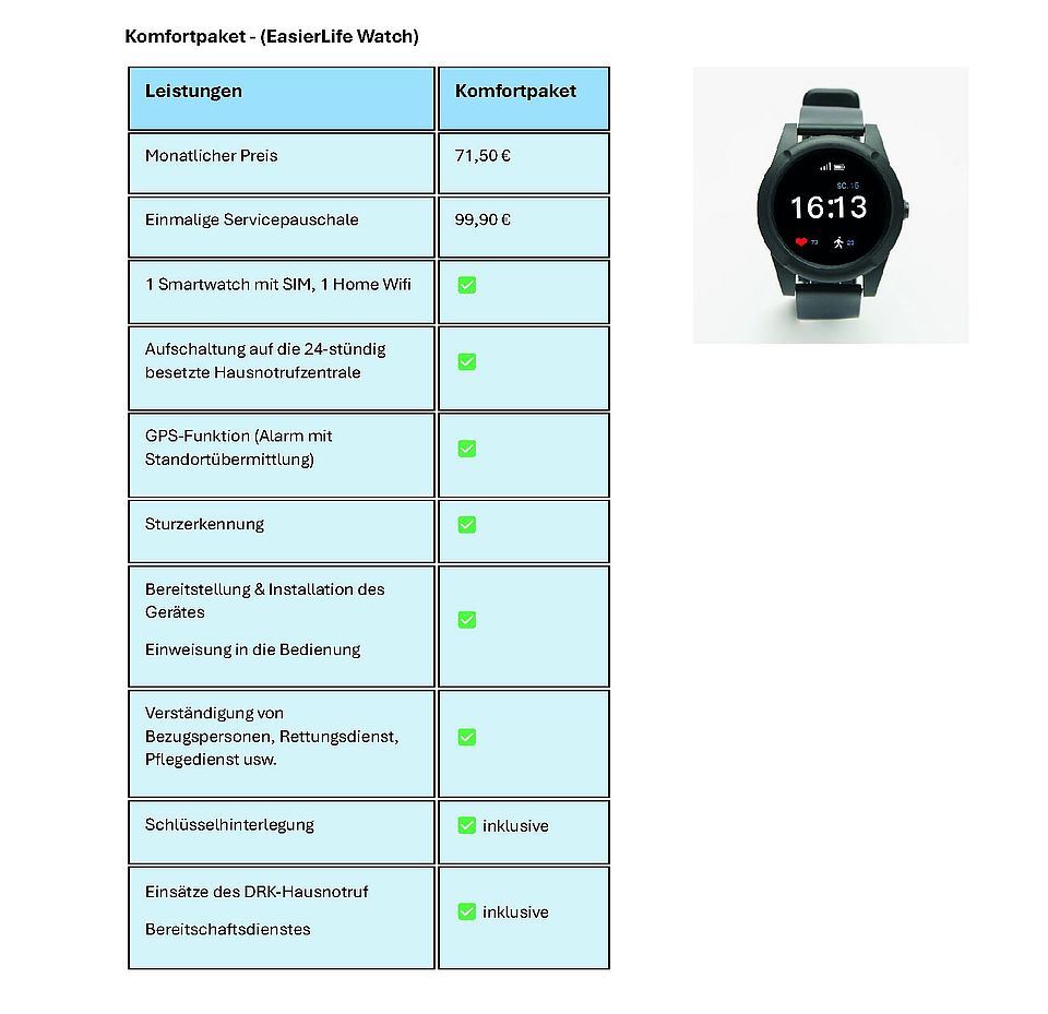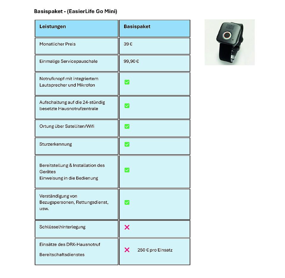 Hier finden Sie unsere Preise und Leistungen der DRK-Notrufuhr einmal als Komfortpaket und einmal als Basispaket.